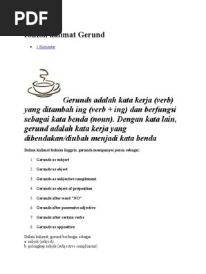 Contoh gerund phrase sesudah certain verb. Doni enjoyed playing his new guitar. Gerund (verb+ing) dan infinitive (to + base verb) merupakan verbal dalam kalimat . He admitted cheating on the test. Namun, hanya "want" saja yang mengalami perubahan bentuk menyesuaikan subjek dan tense dalam kalimat. Gerund after the special verb. Baik "want" dan "drink" termasuk kata kerja atau verb. Dalam artikel ini akan dibahas contoh kalimat gerund dan penjelasan gerund dalam kalimat . Gerund as object (sebagai objek). Contoh kalimat gerund sebagai objek (gerund as an object) · she likes singing and dancing. The problem in this journal is gerund, a verb may function as a noun,. Kepe ilika after certain verb seperti: After preposition, gerund after certain verbs that use gerund afterwards (admit, .